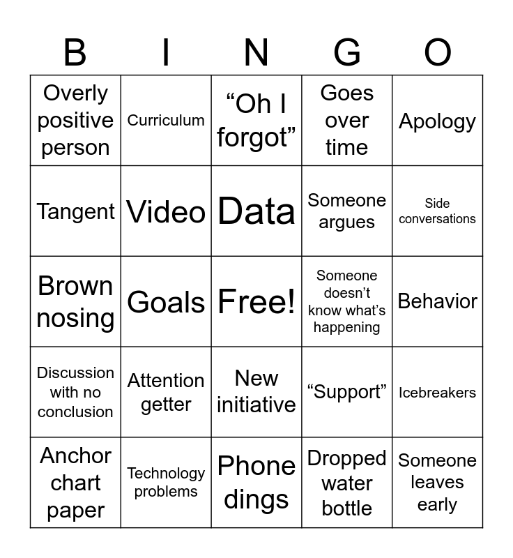 This bingo card has a free space and 28 words: Icebreakers, Summer, Someone argues, Dropped water bottle, Tangent, “Oh I forgot”, Curriculum, Discussion with no conclusion, Someone doesn’t know what’s happening, Anchor chart paper, Brown nosing, Goes over time, Technology problems, Phone dings, Side conversations, Old show reference, Attention getter, Video, Data, New initiative, Overly positive person, Sarcastic comment, Someone leaves early, Goals, Behavior, “Support”, Apology and “Agree” in a nonsensical way.
