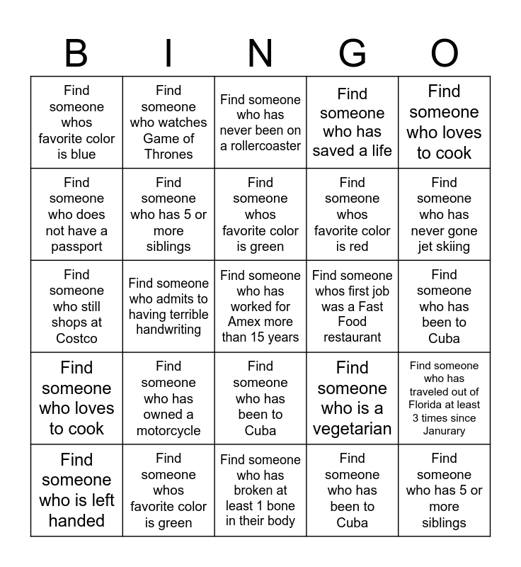 This bingo card has 50 words: Find someone who has worked for Amex less than 1 year, Find someone who has worked for Amex more than 15 years, Find someone who still shops at Costco, Find someone who has broken at least 1 bone in their body, Find someone who has owned a motorcycle, Find someone who played a varsity/college level sport, Find someone who watches Game of Thrones, Find someone who likes Cats better than Dogs, Find someone who does not have a passport, Find someone who has traveled to at least 4 countries, Find someone who has 5 or more siblings, Find someone who has saved a life, Find someone who has traveled out of Florida at least 3 times since Janurary, Find someone who is a vegetarian, Find someone who has worked less than 1 year at Amex, Find someone whos favorite color is blue, Find someone whos favorite color is green, Find someone whos first job was a Fast Food restaurant, Find someone who has never gone jet skiing, Find someone who loves to cook, Find someone who admits to having terrible handwriting, Find someone who has been to Cuba, Find someone whos favorite color is blue, Find someone whos favorite color is red, Find someone whos favorite color is white, Find someone who has 5 or more siblings, Find someone who has never gone jet skiing, Find someone who has traveled to at least 4 countries, Find someone who has never been on a rollercoaster, Find someone who has been to Cuba, Find someone who likes Cats better than Dogs, Find someone who does not have a passport, Find someone who watches Game of Thrones, Find someone who has never been to Disney, Find someone whos favorite color is green, Find someone who has never gone jet skiing, Find someone whos favorite color is red, Find someone who still shops at Costco, Find someone who is afraid of heights, Find someone who has been to Cuba, Find someone that is allergic to avocado, Find someone that speaks more than 2 languages, Find someone who has never been to Disney, Find someone who loves to cook, Find someone who is left handed, Find someone who still shops at Costco, Find someone who has owned a motorcycle, Find someone whos birthday is on a holiday, Find someone who loves to cook and Find someone who has never been to Disney.