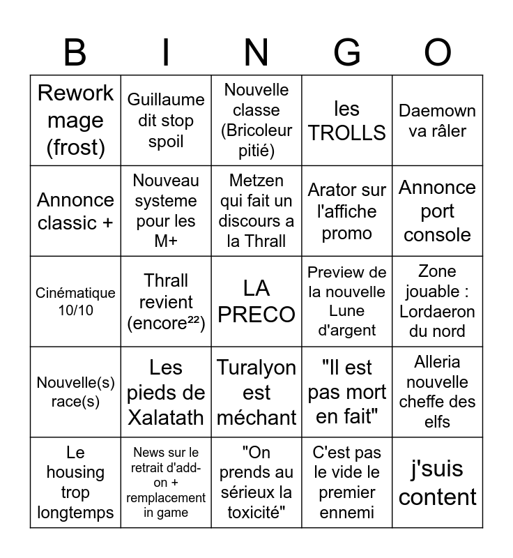 This bingo card has a free space and 24 words: Le housing trop longtemps, Les pieds de Xalatath, Metzen qui fait un discours a la Thrall, C'est pas le vide le premier ennemi, Daemown va râler, Rework mage (frost), Guillaume dit stop spoil, Nouvelle classe (Bricoleur pitié), Preview de la nouvelle Lune d'argent, Zone jouable : Lordaeron du nord, Cinématique 10/10, Nouveau systeme pour les M+, "Il est pas mort en fait", Alleria nouvelle cheffe des elfs, Annonce classic +, News sur le retrait d'add-on + remplacement in game, "On prends au sérieux la toxicité", les TROLLS, Annonce port console, Nouvelle(s) race(s), Thrall revient (encore²²), Turalyon est méchant, Arator sur l'affiche promo and j'suis content.