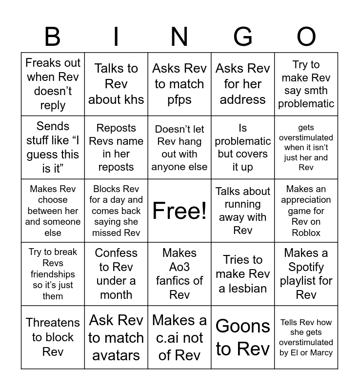 This bingo card has a free space and 24 words: Confess to Rev under a month, Ask Rev to match avatars, Doesn’t let Rev hang out with anyone else, Threatens to block Rev, Try to make Rev say smth problematic, Freaks out when Rev doesn’t reply, Sends stuff like “I guess this is it”, Talks to Rev about khs, Talks about running away with Rev, Makes Ao3 fanfics of Rev, Is problematic but covers it up, Makes Rev choose between her and someone else, Tries to make Rev a lesbian, Makes a Spotify playlist for Rev, Reposts Revs name in her reposts, Goons to Rev, Makes an appreciation game for Rev on Roblox, Asks Rev to match pfps, gets overstimulated when it isn’t just her and Rev, Blocks Rev for a day and comes back saying she missed Rev, Tells Rev how she gets overstimulated by El or Marcy, Try to break Revs friendships so it’s just them, Asks Rev for her address and Makes a c.ai not of Rev.