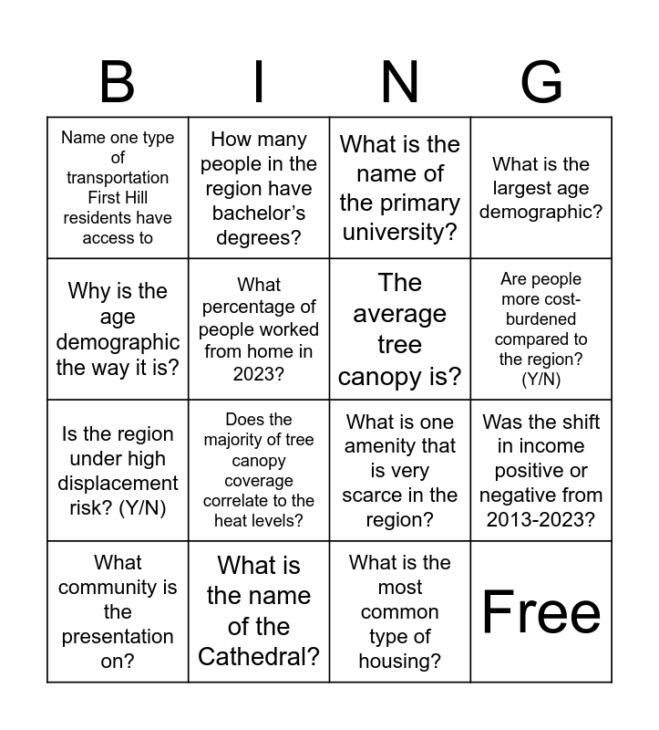 This bingo card has 16 words: What community is the presentation on?, What is the name of the Cathedral?, What is the name of the primary university?, What is the largest age demographic?, Why is the age demographic the way it is?, How many people in the region have bachelor’s degrees?, What is one amenity that is very scarce in the region?, Was the shift in income positive or negative from 2013-2023?, Name one type of transportation First Hill residents have access to, What percentage of people worked from home in 2023?, What is the most common type of housing?, Are people more cost-burdened compared to the region? (Y/N), Is the region under high displacement risk? (Y/N), Does the majority of tree canopy coverage correlate to the heat levels?, The average tree canopy is? and Free.