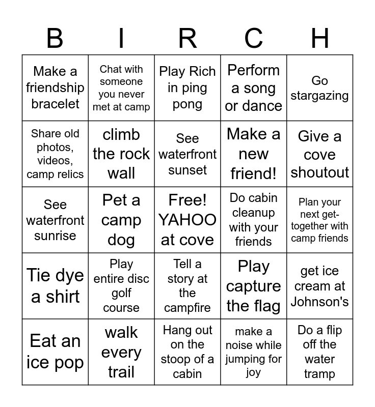 This bingo card has a free space and 24 words: Play entire disc golf course, walk every trail, See waterfront sunset, Eat an ice pop, Go stargazing, Make a friendship bracelet, Share old photos, videos, camp relics, Chat with someone you never met at camp, Do cabin cleanup with your friends, Tell a story at the campfire, Make a new friend!, See waterfront sunrise, Play capture the flag, get ice cream at Johnson's, climb the rock wall, make a noise while jumping for joy, Plan your next get-together with camp friends, Play Rich in ping pong, Give a cove shoutout, Pet a camp dog, Do a flip off the water tramp, Tie dye a shirt, Perform a song or dance and Hang out on the stoop of a cabin.