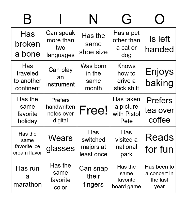 This bingo card has a free space and 24 words: Wears glasses, Has the same favorite color, Was born in the same month, Has run a marathon, Is left handed, Has broken a bone, Has traveled to another continent, Can speak more than two languages, Has taken a picture with Pistol Pete, Has switched majors at least once, Knows how to drive a stick shift, Has the same favorite holiday, Has visited a national park, Reads for fun, Can play an instrument, Has the same favorite board game, Prefers tea over coffee, Has the same shoe size, Enjoys baking, Prefers handwritten notes over digital, Has been to a concert in the last year, Has the same favorite ice cream flavor, Has a pet other than a cat or dog and Can snap their fingers.