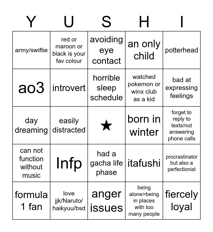This bingo card has a free space and 24 words: Infp, love jjk/Naruto/ haikyuu/bsd, horrible sleep schedule, formula 1 fan, potterhead, army/swiftie, ao3, red or maroon or black is your fav colour, born in winter, had a gacha life phase, watched pokemon or winx club as a kid, day dreaming, itafushi, procrastinator but also a perfectionist, introvert, being alone>being in places with too many people, forget to reply to texts/not answering phone calls, avoiding eye contact, bad at expressing feelings, easily distracted, fiercely loyal, can not function without music, an only child and anger issues.