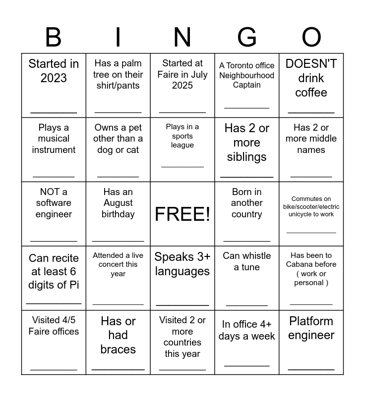 This bingo card has a free space and 24 words: Visited 4/5 Faire offices _________, Attended a live concert this year ____________, Plays in a sports league __________, In office 4+ days a week ________, DOESN'T drink coffee _______, Started in 2023 _______, Has a palm tree on their shirt/pants _________, Started at Faire in July 2025 _________, Born in another country _________, Commutes on bike/scooter/electric unicycle to work ______________, NOT a software engineer _________, Owns a pet other than a dog or cat ________, Can whistle a tune ________, Has been to Cabana before ( work or personal ) __________, Plays a musical instrument ________, Has or had braces ________, Visited 2 or more countries this year _________, A Toronto office Neighbourhood Captain __________, Has 2 or more middle names ________, Can recite at least 6 digits of Pi _________, Has an August birthday __________, Speaks 3+ languages ________, Has 2 or more siblings ________ and Platform engineer _______.