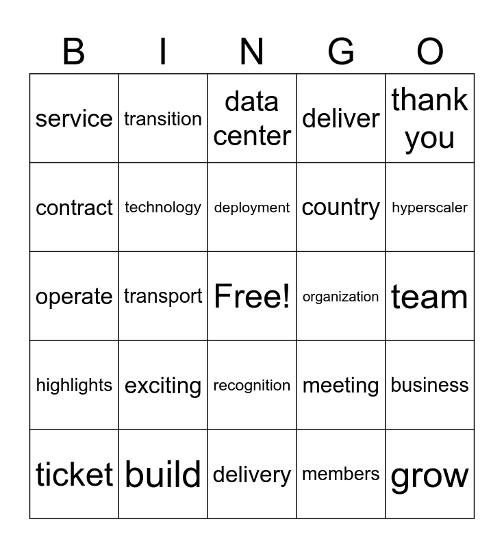 This bingo card has a free space and 31 words: delivery, server, transport, break/fix, service, data center, technology, meeting, organization, members, team, grow, growth, ways of working, hyperscaler, new, business, exciting, highlights, recognition, thank you, speak up, ticket, transition, country, contract, deliver, operate, build, deployment and engineering.