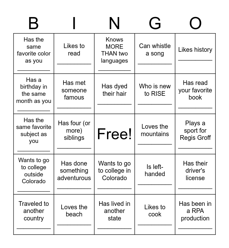 This bingo card has a free space and 29 words: Traveled to another country __________, Can play a musical instrument __________, Has four (or more) siblings __________, Has a pet that is not a dog or a cat __________, Has the same favorite color as you __________, Knows MORE THAN two languages __________, Has met someone famous __________, Has done something adventurous __________, Loves the mountains __________, Loves the beach __________, Plays a sport for Regis Groff __________, Has been in a RPA production __________, Has lived in another state __________, Likes to cook __________, Has read your favorite book __________, Likes to cook __________, Wants to go to college in Colorado __________, Wants to go to college outside Colorado __________, Likes history __________, Has the same favorite subject as you __________, Is left-handed __________, Is in a club or organization at RISE __________, Who is new to RISE __________, Has a birthday in the same month as you __________, Can whistle a song __________, Likes to read __________, Has their driver's license __________, Has dyed their hair __________ and You share the first letter of your first name __________.