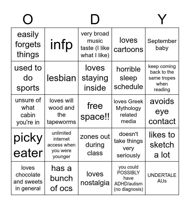 This bingo card has a free space and 24 words: unlimited internet access when you were younger, has a bunch of ocs, loves staying inside, loves chocolate and sweets in general, September baby, easily forgets things, used to do sports, infp, loves Greek Mythology related media, zones out during class, horrible sleep schedule, unsure of what cabin you're in, doesn't take things very seriously, likes to sketch a lot, lesbian, you could POSSIBLY have ADHD/autism (no diagnosis), avoids eye contact, very broad music taste (I like what I like), keep coming back to the same tropes when reading, loves will wood and the tapeworms, UNDERTALE AUs, picky eater, loves cartoons and loves nostalgia.