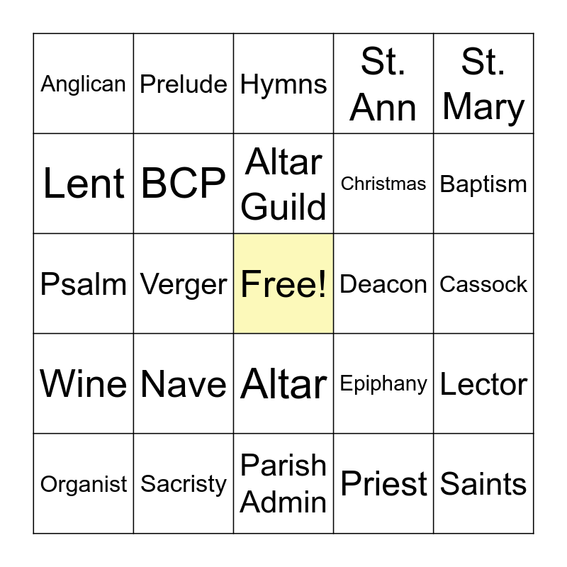 This bingo card has a free space and 44 words: Prayer, Saints, Peace, Organist, Bulletin, Priest, Hymns, Vestments, St. Mary, Sacristy, St. Ann, Deacon, Altar, Nave, Sanctuary, Parish Admin, RCL, Psalm, Gospel, Baptism, Prelude, Trinity, Eucharist, Anglican, St. Paul, Cassock, Easter, Pentecost, Epiphany, Wine, Coffee Hour, Lector, Oil, Chalice, Verger, Acolyte, Advent, Sacrament, Altar Guild, Lent, Christmas, LEM, BCP and Worship.