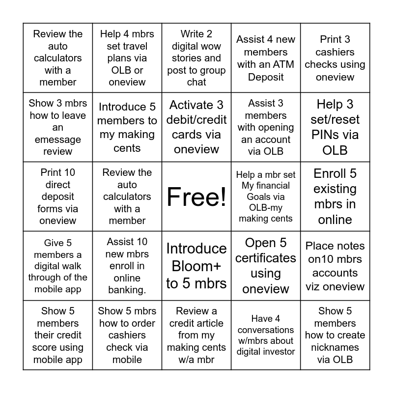 This bingo card has a free space and 24 words: Assist 10 new mbrs enroll in online banking., Show 5 mbrs how to order cashiers check via mobile, Activate 3 debit/credit cards via oneview, Show 5 members their credit score using mobile app, Print 3 cashiers checks using oneview, Review the auto calculators with a member, Show 3 mbrs how to leave an emessage review, Help 4 mbrs set travel plans via OLB or oneview, Help a mbr set My financial Goals via OLB-my making cents, Introduce Bloom+ to 5 mbrs, Assist 3 members with opening an account via OLB, Print 10 direct deposit forms via oneview, Open 5 certificates using oneview, Place notes on10 mbrs accounts viz oneview, Introduce 5 members to my making cents, Have 4 conversations w/mbrs about digital investor, Enroll 5 existing mbrs in online, Write 2 digital wow stories and post to group chat, Help 3 set/reset PINs via OLB, Review the auto calculators with a member, Show 5 members how to create nicknames via OLB, Give 5 members a digital walk through of the mobile app, Assist 4 new members with an ATM Deposit and Review a credit article from my making cents w/a mbr.