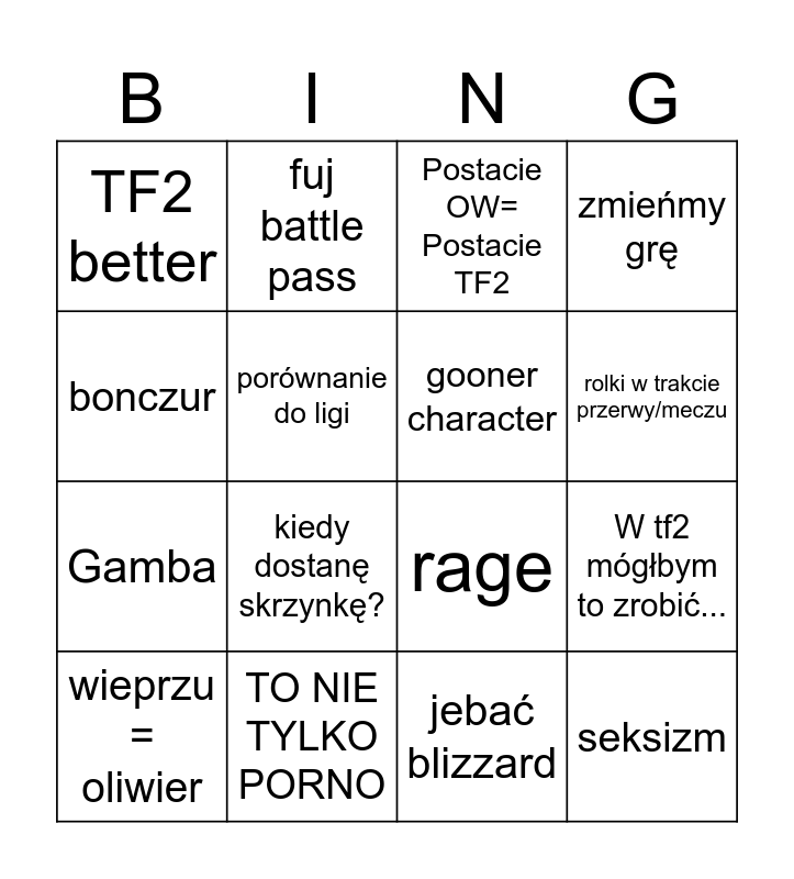 This bingo card has 16 words: TO NIE TYLKO PORNO, W tf2 mógłbym to zrobić..., Postacie OW= Postacie TF2, TF2 better, Gamba, fuj battle pass, rage, jebać blizzard, bonczur, porównanie do ligi, wieprzu = oliwier, zmieńmy grę, kiedy dostanę skrzynkę?, rolki w trakcie przerwy/meczu, gooner character and seksizm.