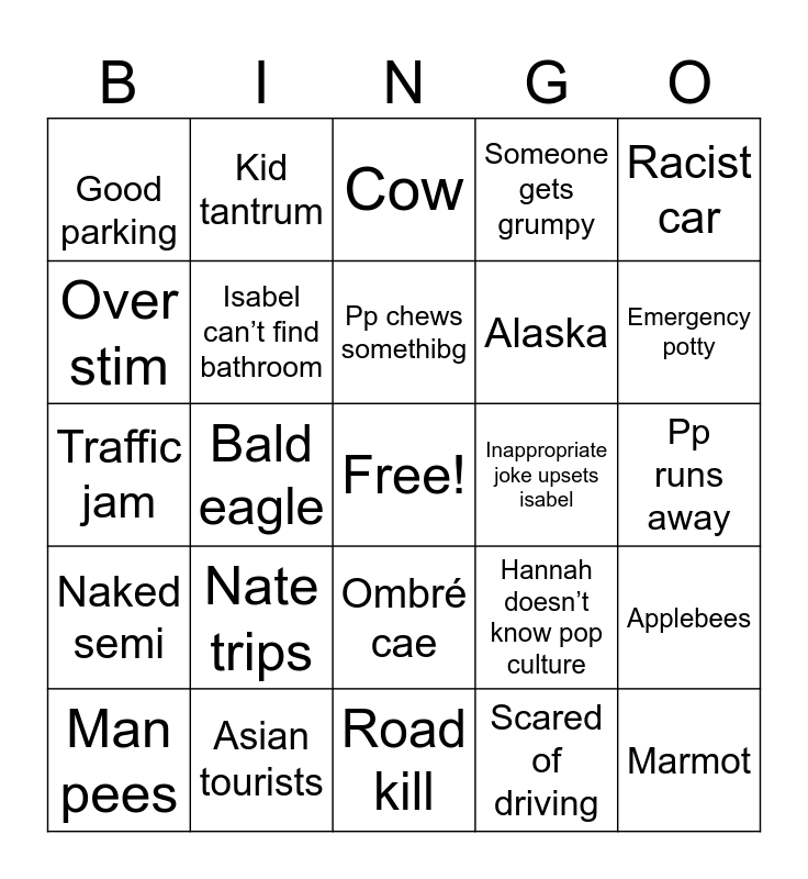 This bingo card has a free space and 24 words: Nate trips, Asian tourists, Pp chews somethibg, Man pees, Racist car, Good parking, Over stim, Kid tantrum, Inappropriate joke upsets isabel, Ombré cae, Alaska, Traffic jam, Hannah doesn’t know pop culture, Applebees, Isabel can’t find bathroom, Scared of driving, Pp runs away, Cow, Emergency potty, Bald eagle, Marmot, Naked semi, Someone gets grumpy and Road kill.
