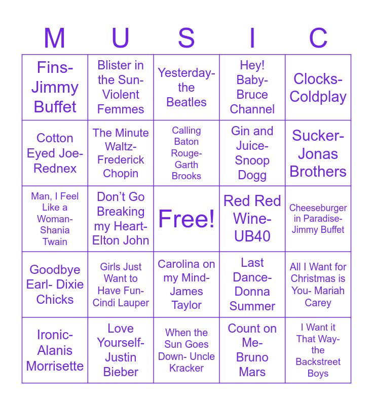 This bingo card has a free space and 65 words: Dancing in the Moonlight- King Harvest, Africa- Toto, All About That Bass- Meghan Trainor, All I Want for Christmas is You- Mariah Carey, All You Need is Love- the Beatles, Baby One More Time- Britney Spears, Blister in the Sun- Violent Femmes, Breaking Up is Hard to Do- Neil Sedaka, Calling Baton Rouge- Garth Brooks, Candle in the Wind- Elton John, Carolina on my Mind- James Taylor, Chattahoochie- Alan Jackson, Cheeseburger in Paradise- Jimmy Buffet, Clocks- Coldplay, Copa Cabana- Barry Manilow, Cotton Eyed Joe- Rednex, Don’t Go Breaking my Heart- Elton John, Fins- Jimmy Buffet, The Gambler- Kenny Rogers, Gin and Juice- Snoop Dogg, Girls Just Want to Have Fun- Cindi Lauper, Goodbye Earl- Dixie Chicks, Hey! Baby- Bruce Channel, Hit Me with Your Best Shot- Pat Benetar, Hold On- Wilson Philips, Mmm Bop- Hanson, Honky Tonk Woman- the Rolling Stones, I Wanna Dance with Somebody- Whitney Houston, I Want it That Way- the Backstreet Boys, I'm Still Standing- Elton John, Ironic- Alanis Morrisette, Jack and Diane- John Mellencamp, Jolene- Dolly Parton, Joy to the World, Last Dance- Donna Summer, Love Yourself- Justin Bieber, Mambo #5- Lou Bega, Man, I Feel Like a Woman- Shania Twain, Count on Me- Bruno Mars, Mean- Taylor Swift, The Minute Waltz- Frederick Chopin, Only the Good Die Young- Billy Joel, Red Red Wine- UB40, Rockin Robin- Bobby Day, Root Beer Rag- Billy Joel, Runaround Sue- Dion & the Belmonts, Sucker- Jonas Brothers, Take on Me- Aha, Total Eclipse of the Heart- Bonnie Tyler, Tubthumping- Chumbawumba, Waterloo- ABBA, Way You Do the Things You Do- Temptations, What Makes You Beautiful- One Direction, When the Sun Goes Down- Uncle Kracker, Wonderful Tonight- Eric Clapton, Wouldn’t It Be Nice- the Beach Boys, YMCA- the Village People, Yesterday- the Beatles, You Are So Beautiful- Joe Cocker, Call Me Al- Paul Simon, You Are the Sunshine of My Life- Stevie Wonder, Conga- Miami Sound Machine, Dixieland Delight- Alabama, Shake It Off- Taylor Swift and I'll Be There- Jackson Five.