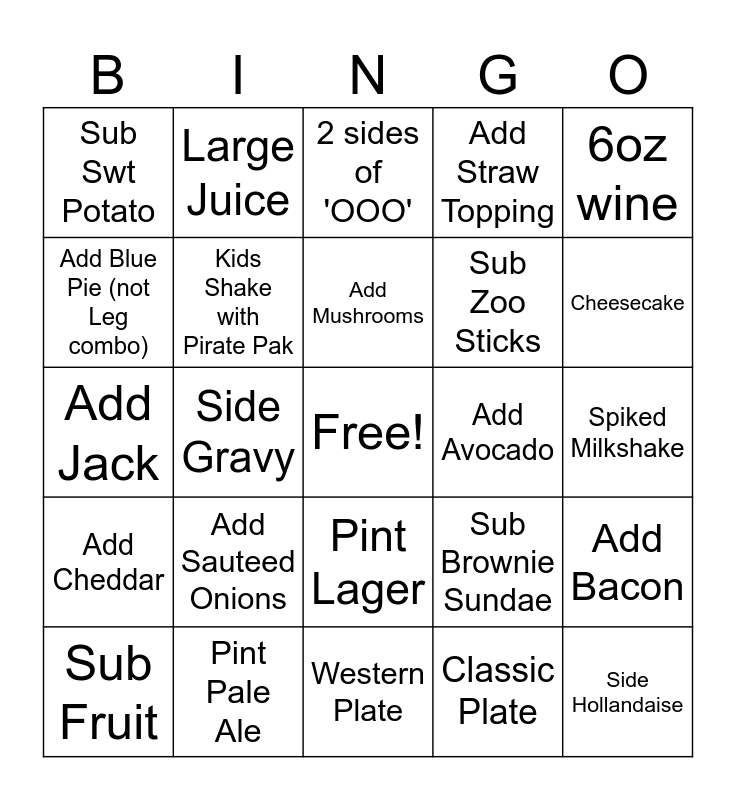 This bingo card has a free space and 24 words: Sub Fruit, Add Sauteed Onions, Add Mushrooms, Classic Plate, 6oz wine, Sub Swt Potato, Large Juice, 2 sides of 'OOO', Add Avocado, Spiked Milkshake, Add Jack, Kids Shake with Pirate Pak, Sub Brownie Sundae, Add Bacon, Add Blue Pie (not Leg combo), Pint Pale Ale, Western Plate, Add Straw Topping, Cheesecake, Add Cheddar, Side Gravy, Pint Lager, Sub Zoo Sticks and Side Hollandaise.