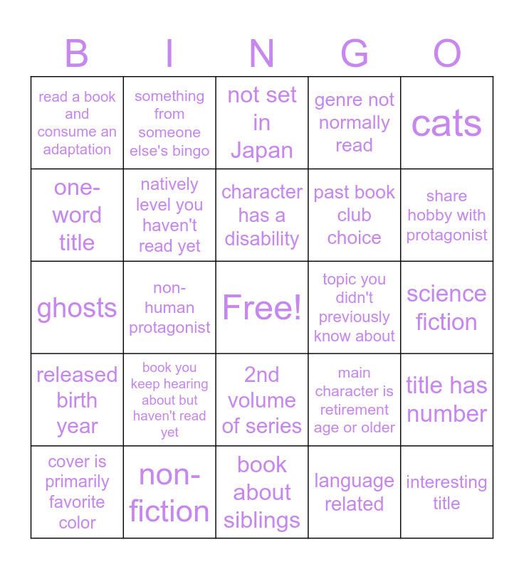 This bingo card has a free space and 24 words: book you keep hearing about but haven't read yet, non-fiction, character has a disability, cover is primarily favorite color, cats, read a book and consume an adaptation, one-word title, something from someone else's bingo, topic you didn't previously know about, 2nd volume of series, past book club choice, ghosts, main character is retirement age or older, title has number, natively level you haven't read yet, language related, science fiction, not set in Japan, share hobby with protagonist, non-human protagonist, interesting title, released birth year, genre not normally read and book about siblings.