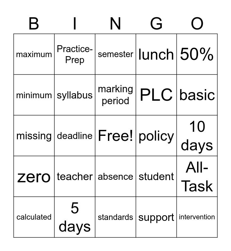 This bingo card has a free space and 32 words: support, email, deadline, due date, zero, syllabus, 50%, All-Task, Practice-Prep, extended time, marking period, semester, calendar, reassessment, policy, revised, calculated, missing, absence, teacher, student, parent, 10 days, 5 days, intervention, lunch, PLC, minimum, maximum, standards, accuracy and basic.