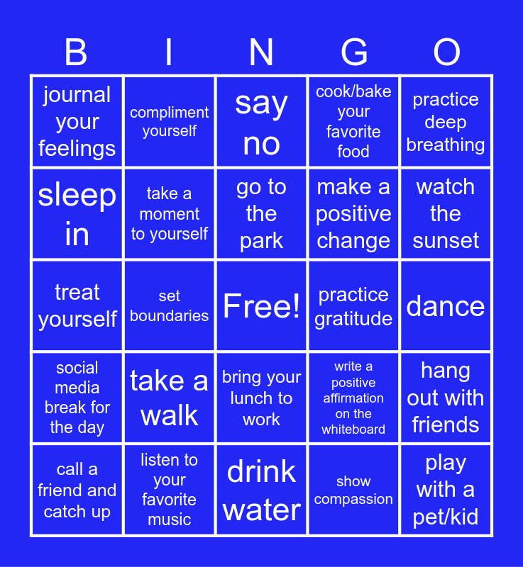 This bingo card has a free space and 24 words: take a walk, listen to your favorite music, go to the park, call a friend and catch up, practice deep breathing, journal your feelings, sleep in, compliment yourself, practice gratitude, bring your lunch to work, make a positive change, treat yourself, write a positive affirmation on the whiteboard, hang out with friends, take a moment to yourself, show compassion, dance, say no, watch the sunset, set boundaries, play with a pet/kid, social media break for the day, cook/bake your favorite food and drink water.