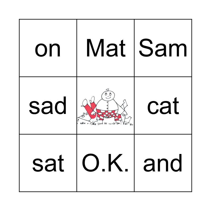 This bingo card has a free space and 8 words: cat, Sam, Mat, sat, on, and, sad and O.K..