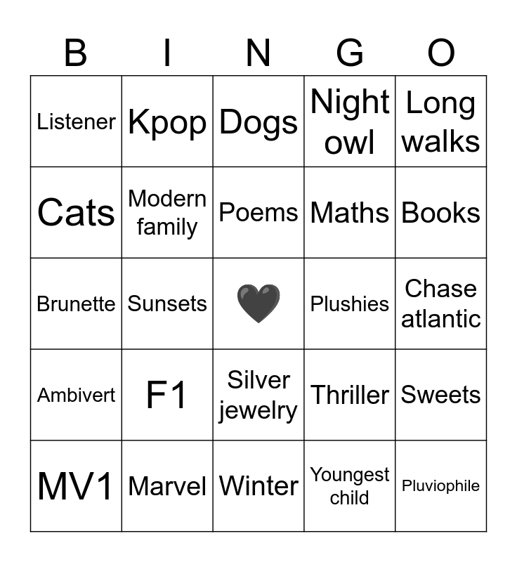 This bingo card has a free space and 24 words: F1, Marvel, Poems, MV1, Long walks, Listener, Cats, Kpop, Plushies, Silver jewelry, Maths, Brunette, Thriller, Sweets, Modern family, Youngest child, Chase atlantic, Dogs, Books, Sunsets, Pluviophile, Ambivert, Night owl and Winter.