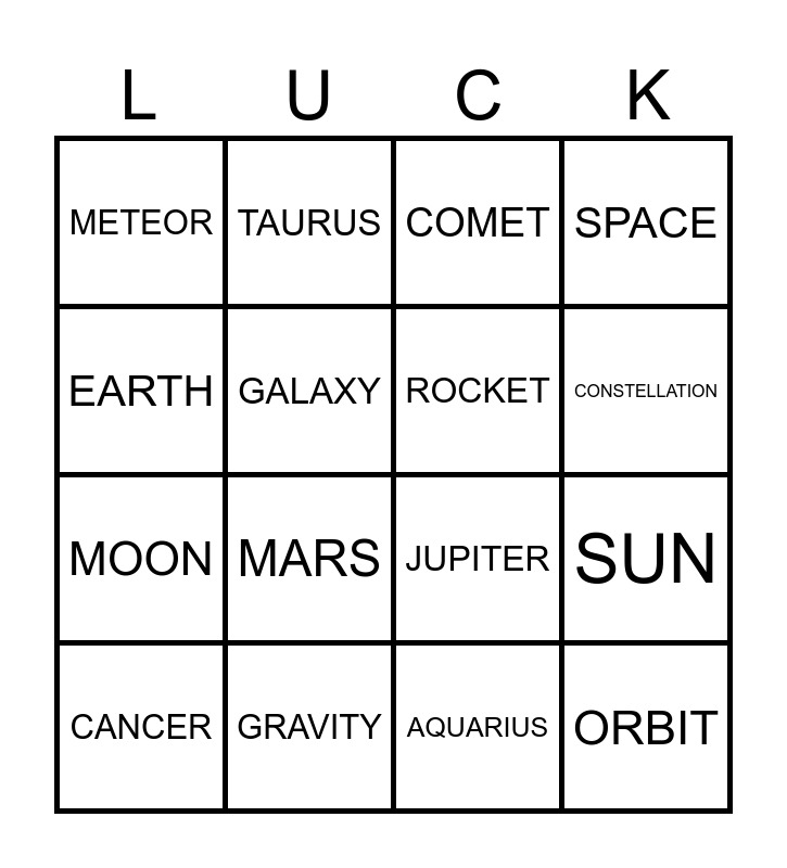 This bingo card has 20 words: SUN, GEMINI, COMET, PLUTO, CANCER, EARTH, GRAVITY, METEOR, MOON, TAURUS, MARS, JUPITER, GALAXY, ORBIT, ROCKET, VENUS, CONSTELLATION, SPACE, AQUARIUS and STARS.