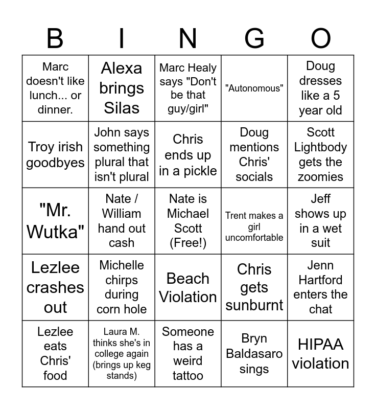 This bingo card has a free space and 24 words: Michelle chirps during corn hole, Laura M. thinks she's in college again (brings up keg stands), Chris ends up in a pickle, Lezlee eats Chris' food, Doug dresses like a 5 year old, Marc doesn't like lunch... or dinner., Troy irish goodbyes, Alexa brings Silas, Trent makes a girl uncomfortable, Beach Violation, Doug mentions Chris' socials, "Mr. Wutka", Chris gets sunburnt, Jenn Hartford enters the chat, John says something plural that isn't plural, Bryn Baldasaro sings, Jeff shows up in a wet suit, Marc Healy says "Don't be that guy/girl", Scott Lightbody gets the zoomies, Nate / William hand out cash, HIPAA violation, Lezlee crashes out, "Autonomous" and Someone has a weird tattoo.