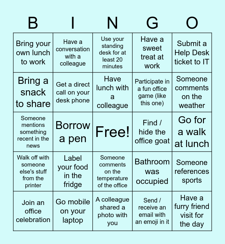 This bingo card has a free space and 39 words: Misplace / lose a pen, Deliver something from the copier, Refill the water cooler, Get a direct call on your desk phone, Join an office celebration, Someone comments on the temperature of the office, Have lunch with a colleague, Copier / Printer jam, Submit a Help Desk ticket to IT, Walk off with someone else's stuff from the printer, Borrow a pen, Have a sweet treat at work, Have a furry friend visit for the day, Go for a walk at lunch, Find / hide the office goat, Label your food in the fridge, Have a donut brought by a colleague, Bring your own lunch to work, Enjoy lunch at the TMDR, Bathroom was occupied, Bring a snack to share, A colleague shared a photo with you, Participate in a fun office game (like this one), Someone comments on the weather, Someone mentions traffic, Someone tells a joke, Talk out loud to yourself, Take a moment to stretch, Someone references a movie, Have a conversation with a colleague, A colleague is humming to themselves, A colleague goes to / returns from vacation, Use your standing desk for at least 20 minutes, Go mobile on your laptop, Send / receive an email with an emoji in it, Listen to music while working, Someone references sports, Someone mentions something recent in the news and Schedule / Attend a meeting.