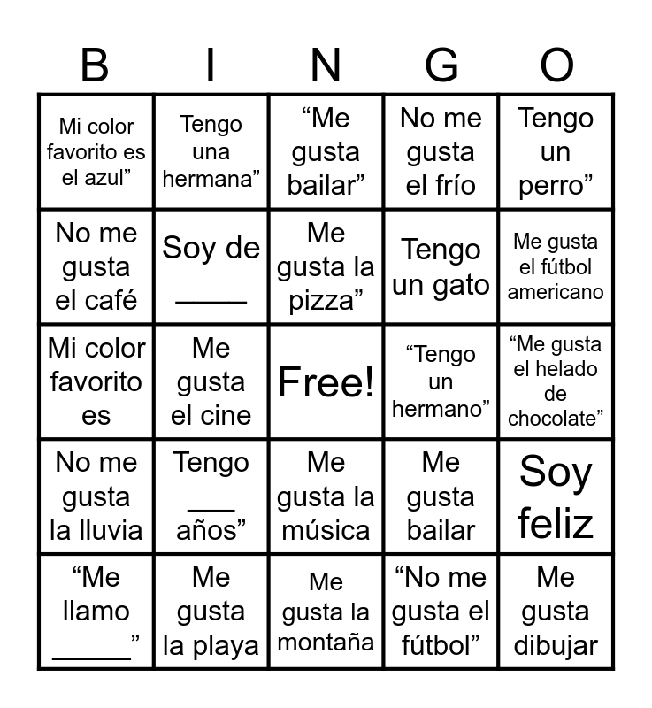 This bingo card has a free space and 24 words: “Me llamo _____”, Tengo ___ años”, Me gusta la pizza”, “No me gusta el fútbol”, Tengo un perro”, Mi color favorito es el azul”, Tengo una hermana”, “Me gusta bailar”, “Tengo un hermano”, “Me gusta el helado de chocolate”, Mi color favorito es, Soy de ____, Me gusta bailar, Soy feliz, No me gusta el café, Me gusta la playa, Me gusta la montaña, No me gusta el frío, Me gusta el fútbol americano, No me gusta la lluvia, Me gusta el cine, Me gusta la música, Tengo un gato and Me gusta dibujar.