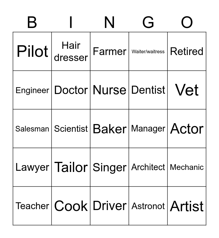 This bingo card has 27 words: Architect, Artist, Dentist, Driver, Engineer, Farmer, Hair dresser, Lawyer, Manager, Mechanic, Salesman, Waiter/waitress, Teacher, Cook, Vet, Worker, Doctor, Nurse, Tailor, Pilot, Actor, Astronot, Scientist, Baker, Singer, Retired and President.