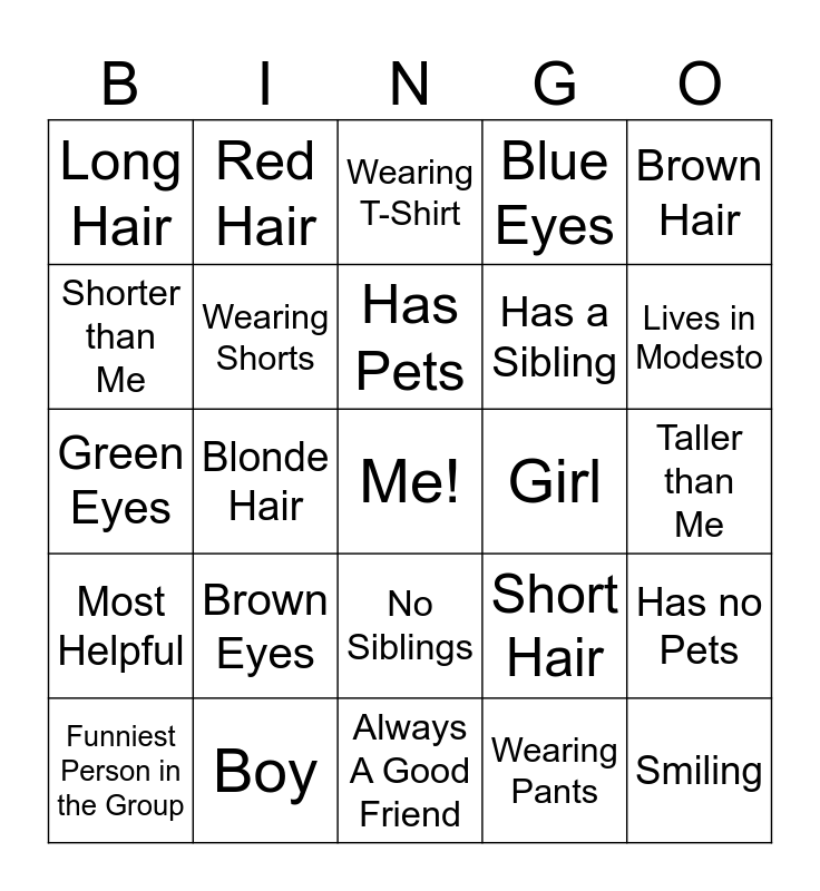 This bingo card has a free space and 24 words: Brown Eyes, Boy, Has Pets, Funniest Person in the Group, Brown Hair, Long Hair, Shorter than Me, Red Hair, Girl, No Siblings, Has a Sibling, Green Eyes, Short Hair, Has no Pets, Wearing Shorts, Wearing Pants, Taller than Me, Wearing T-Shirt, Lives in Modesto, Blonde Hair, Smiling, Most Helpful, Blue Eyes and Always A Good Friend.