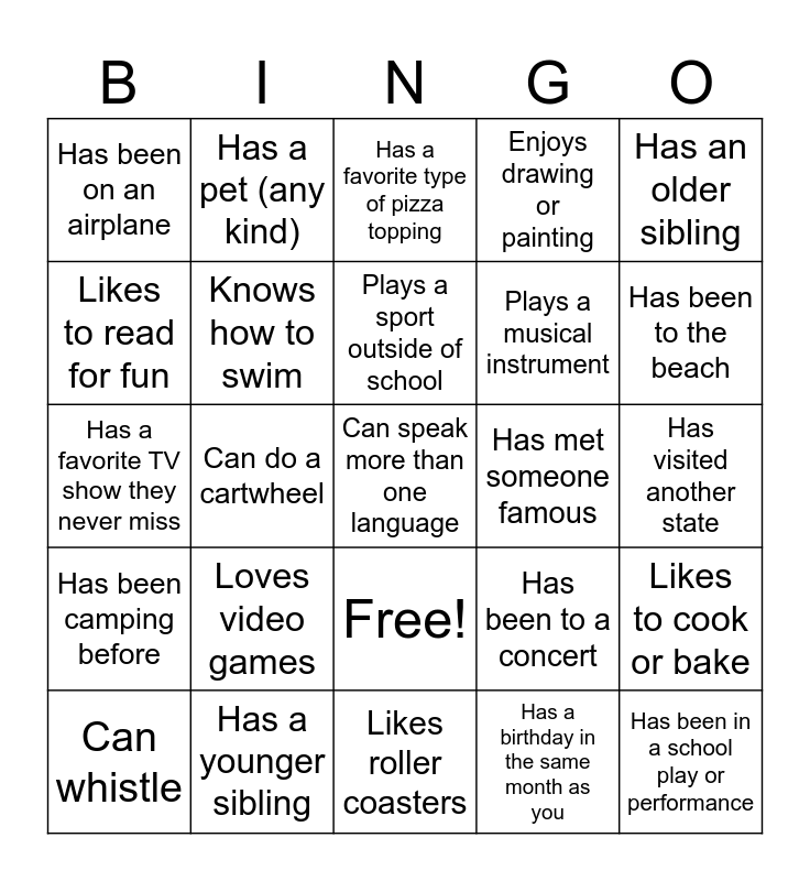 This bingo card has 26 words: Free!, Has a birthday in the same month as you, Plays a sport outside of school, Has a younger sibling, Has an older sibling, Has been on an airplane, Likes to read for fun, Has a pet (any kind), Has visited another state, Has been to a concert, Plays a musical instrument, Has a favorite TV show they never miss, Likes to cook or bake, Can whistle, Can do a cartwheel, Has a favorite holiday tradition, Enjoys drawing or painting, Has been camping before, Has a favorite type of pizza topping, Can speak more than one language, Has been to the beach, Likes roller coasters, Has met someone famous, Loves video games, Knows how to swim and Has been in a school play or performance.
