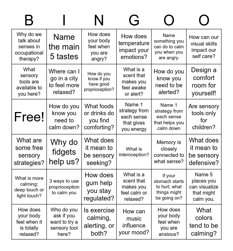 This bingo card has 36 words: What is a scent that makes you feel calm or relaxed?, How does gum help you stay regulated?, How can music influence your mood?, What sensory tools are available to you here?, What are some free sensory strategies?, Name 1 strategy from each sense that gives you energy, Where can I go in a city to feel more relaxed?, Is exercise calming, alerting, or both?, Name something you can do to calm you when you are angry., If your stomach starts to hurt, what things might be going on?, Design a comfort room for yourself!, How does temperature impact your emotions?, Name 5 places you can visualize that might calm you., How do you know you need to calm down?, What is a scent that makes you feel awake or alert?, Why do we talk about senses in occupational therapy?, What is more calming: deep touch or light touch?, Name 1 strategy from each sense that helps you calm down, Free!, How does your body feel when you are angry?, What foods or drinks do you find comforting?, Why do fidgets help us?, What is interoception?, What does it mean to be sensory seeking?, Memory is closely connected to what sense?, Name the main 5 tastes, How do you know you need to be alerted?, Who do you ask if you want to try a sensory tool here?, How do you know if you have good proprioception?, How can our visual skills impact our self care?, What colors tend to be calming?, How does your body feel when it is totally relaxed?, What does it mean to be sensory defensive?, Are sensory tools only for children?, 3 ways to use proprioception to calm you and How does your body feel when you are anxious?.