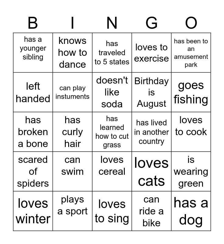 This bingo card has a free space and 24 words: can swim, plays a sport, doesn't like soda, loves winter, has been to an amusement park, has a younger sibling, left handed, knows how to dance, has lived in another country, loves cereal, Birthday is August, has broken a bone, loves cats, is wearing green, can play instuments, can ride a bike, loves to cook, has traveled to 5 states, goes fishing, has curly hair, has a dog, scared of spiders, loves to exercise and loves to sing.