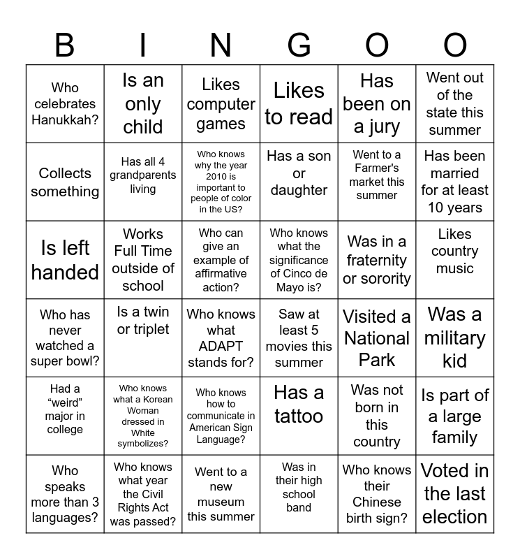 This bingo card has 36 words: Has a tattoo, Who knows how to communicate in American Sign Language?, Was in their high school band, Collects something, Who has never watched a super bowl?, Who knows what the significance of Cinco de Mayo is?, Has all 4 grandparents living, Went to a new museum this summer, Has been on a jury, Was not born in this country, Has been married for at least 10 years, Likes to read, Is part of a large family, Works Full Time outside of school, Has a son or daughter, Who celebrates Hanukkah?, Had a “weird” major in college, Was in a fraternity or sorority, Is left handed, Likes computer games, Who can give an example of affirmative action?, Is a twin or triplet, Saw at least 5 movies this summer, Who knows what ADAPT stands for?, Visited a National Park, Is an only child, Went to a Farmer's market this summer, Who knows what year the Civil Rights Act was passed?, Who knows why the year 2010 is important to people of color in the US?, Went out of the state this summer, Voted in the last election, Who speaks more than 3 languages?, Was a military kid, Likes country music, Who knows what a Korean Woman dressed in White symbolizes? and Who knows their Chinese birth sign?.