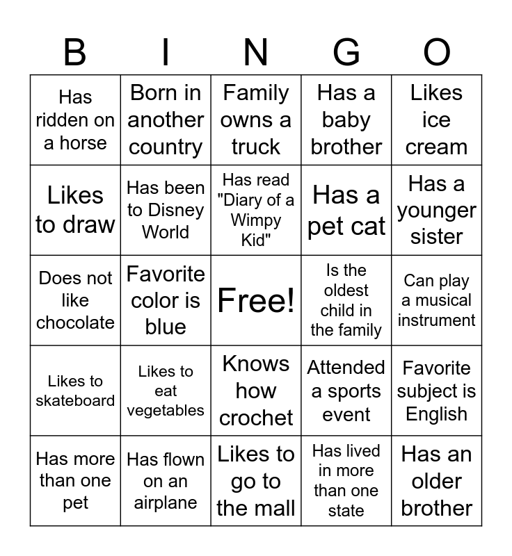This bingo card has a free space and 24 words: Likes to eat vegetables, Has flown on an airplane, Has read "Diary of a Wimpy Kid", Has more than one pet, Likes ice cream, Has ridden on a horse, Likes to draw, Born in another country, Is the oldest child in the family, Knows how crochet, Has a pet cat, Does not like chocolate, Attended a sports event, Favorite subject is English, Has been to Disney World, Has lived in more than one state, Can play a musical instrument, Family owns a truck, Has a younger sister, Favorite color is blue, Has an older brother, Likes to skateboard, Has a baby brother and Likes to go to the mall.