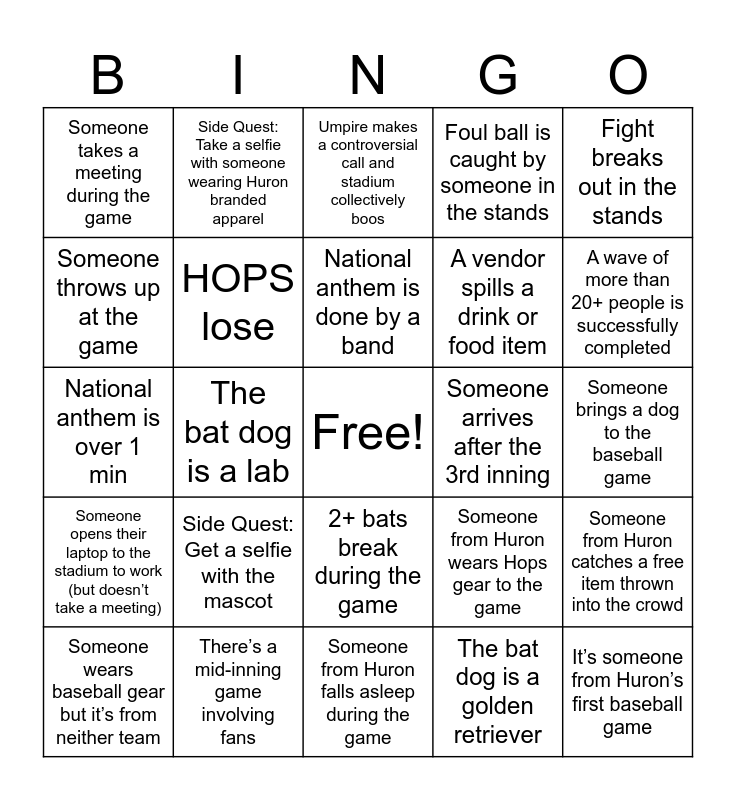This bingo card has a free space and 35 words: Someone from Huron chugs a beer, Someone falls in the stands, HOPS win, HOPS lose, 2+ bats break during the game, Foul ball is caught by someone in the stands, Someone throws up at the game, National anthem is sung by an individual person, National anthem is done by a band, National anthem is under 1 min, National anthem is over 1 min, Fight breaks out in the stands, Someone from Huron spills a full beer, Game goes into extra innings, Someone takes a meeting during the game, Someone arrives after the 3rd inning, The bat dog is a golden retriever, The bat dog is a lab, Someone opens their laptop to the stadium to work (but doesn’t take a meeting), It’s someone from Huron’s first baseball game, Someone from Huron wears Hops gear to the game, Someone wears baseball gear but it’s from neither team, Someone from Huron catches a free item thrown into the crowd, There’s a mid-inning game involving fans, Umpire makes a controversial call and stadium collectively boos, A wave of more than 20+ people is successfully completed, Someone is wearing a jersey from a completely different sport, A ball gets tossed back into the field by a fan, A vendor spills a drink or food item, Someone brings a dog to the baseball game, Someone holds up a funny or clever sign, Someone from Huron falls asleep during the game, Side Quest: Get a selfie with the mascot, Side Quest: Take a selfie with someone wearing Huron branded apparel and Side Quest: Start a wave.