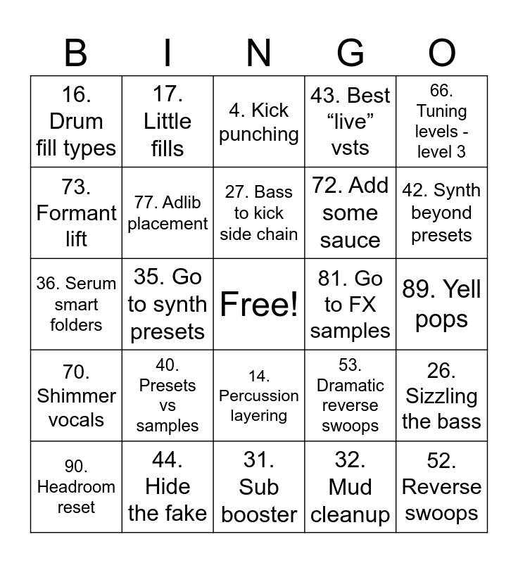 This bingo card has a free space and 99 words: 1. Go to drum samples, 2. Drum styling - theory, 3. Drum styling - application, 4. Kick punching, 5. Kick deconstruction, 6. Tuning kicks, 7. Kick stomp layering, 8. Snare smack, 9. Snare processing, 10. The full snare stack, 11. Tonal snare layering, 12. Natural clap stack, 13. Tuning toms, 14. Percussion layering, 15. Drum fill placements, 16. Drum fill types, 17. Little fills, 18. Groove delay by element, 19. Groove delay by hits, 20. Loop flip, 21. Drum bending, 22. Go to bass presets, 23. Choosing the right bass, 24. Synth bass types, 25. The bass buzz, 26. Sizzling the bass, 27. Bass to kick side chain, 28. 808 swoops, 29. Sub pull and sub drops, 30. Ghost sub, 31. Sub booster, 32. Mud cleanup, 33. Bass fade control, 34. Bass manual edits, 35. Go to synth presets, 36. Serum smart folders, 37. Synth styling, 38. Synth jobs - theory, 39. Synth jobs application, 40. Presets vs samples, 41. Easy preset tweaks, 42. Synth beyond presets, 43. Best “live” vsts, 44. Hide the fake, 45. Realism through layers, 46. Realistic piano sustain, 47. Melodyne flip, 48. Melodyne RX, 49. Shake things up, 50. Space and texture layers, 51. Remake the setting, 52. Reverse swoops, 53. Dramatic reverse swoops, 54. Spicy pitch bends, 55. Transition melody, 56. Hook replay, 57. Stab the top, 58. Something super high, 59. Smart instrumental stacking, 60. “Magic” vocal frequencies, 61. Vocal sends blueprint - verb, 62. Vocal sends blueprint - delay, 63. Vocal sends blueprint -doubler, 64. Tuning levels - level 1, 65. Tuning levels - level 2, 66. Tuning levels - level 3, 67. Vocal emphasis, 68. Clean up the nasties - automatic, 69. Clean up the nasties - manual, 70. Shimmer vocals, 71. Wobble verb, 72. Add some sauce, 73. Formant lift, 74. Octave drop layer, 75. Easy telephone effect, 76. Non-singing vocal textures, 77. Adlib placement, 78. Room vocal stacks, 79. Syllable hooks, 80. Vocals as instrument, 81. Go to FX samples, 82. Reverse it, 83. Accent FX, 84. Verb tails as sweeps, 85. Noise layers, 86. Organic sweeps, 87. Tiny impacts, 88. Crowd noise, 89. Yell pops, 90. Headroom reset, 91. Two-volume mixing, 92. Group processing, 93. Mixing around the vocals, 94. Mixing the big three, 95. EQ offenders, 96. Dynamic panning, 97. Verb smudging, 98. Spot features and 99. Noise cleanup.