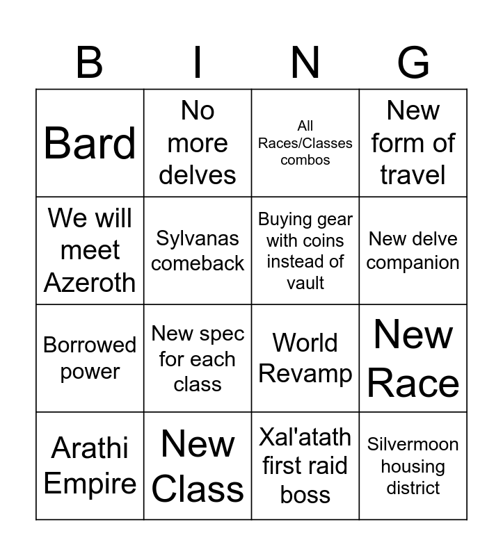 This bingo card has 16 words: New Class, New Race, All Races/Classes combos, Bard, Borrowed power, No more delves, World Revamp, Xal'atath first raid boss, We will meet Azeroth, Sylvanas comeback, Arathi Empire, New form of travel, New spec for each class, New delve companion, Buying gear with coins instead of vault and Silvermoon housing district.