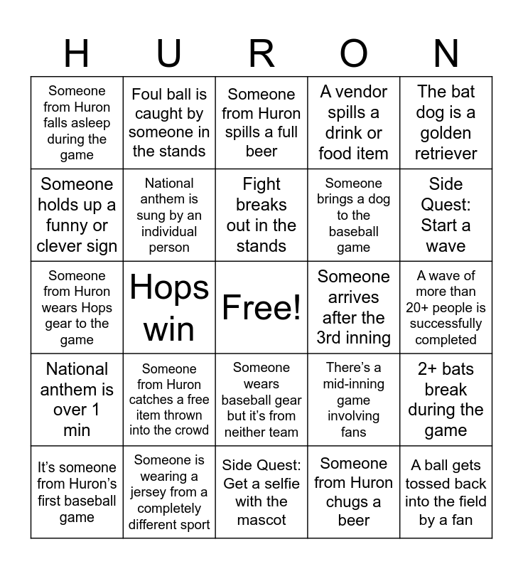 This bingo card has a free space and 32 words: Someone from Huron chugs a beer, Someone falls in the stands, Hops win, Score difference is greater than 2, National anthem is over 1 min, National anthem is sung by an individual person, The bat dog is a golden retriever, 2+ bats break during the game, Foul ball is caught by someone in the stands, Someone throws up at the game, Fight breaks out in the stands, Someone from Huron spills a full beer, Game goes into extra innings, Someone takes a meeting during the game, Someone arrives after the 3rd inning, Someone opens their laptop to the stadium to work (but doesn’t take a meeting), It’s someone from Huron’s first baseball game, Someone from Huron wears Hops gear to the game, Someone wears baseball gear but it’s from neither team, Someone from Huron catches a free item thrown into the crowd, There’s a mid-inning game involving fans, Umpire makes a controversial call and stadium collectively boos, A wave of more than 20+ people is successfully completed, Someone is wearing a jersey from a completely different sport, A ball gets tossed back into the field by a fan, A vendor spills a drink or food item, Someone brings a dog to the baseball game, Someone holds up a funny or clever sign, Someone from Huron falls asleep during the game, Side Quest: Get a selfie with the mascot, Side Quest: Take a selfie with someone wearing Huron branded apparel and Side Quest: Start a wave.