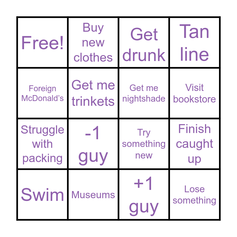 This bingo card has 16 words: Swim, Museums, Get drunk, Tan line, Foreign McDonald’s, Buy new clothes, Try something new, Finish caught up, Free!, Get me trinkets, +1 guy, Visit bookstore, Struggle with packing, -1 guy, Get me nightshade and Lose something.