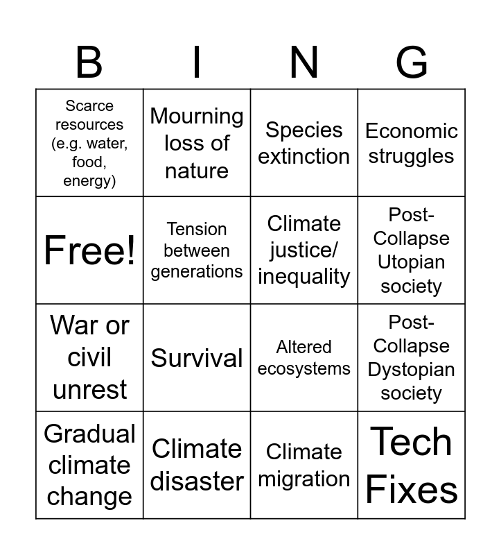 This bingo card has 16 words: Climate disaster, Post-Collapse Dystopian society, Species extinction, Scarce resources (e.g. water, food, energy), War or civil unrest, Mourning loss of nature, Altered ecosystems, Climate migration, Free!, Tension between generations, Gradual climate change, Economic struggles, Survival, Post-Collapse Utopian society, Climate justice/ inequality and Tech Fixes.