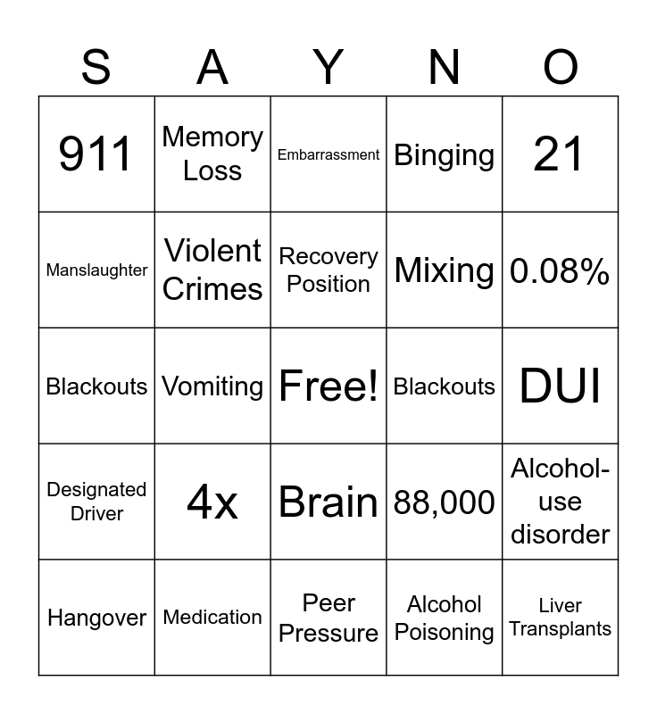 This bingo card has a free space and 24 words: 4x, Medication, Recovery Position, Hangover, 21, 911, Manslaughter, Memory Loss, Blackouts, Brain, Mixing, Blackouts, 88,000, Alcohol-use disorder, Violent Crimes, Alcohol Poisoning, DUI, Embarrassment, 0.08%, Vomiting, Liver Transplants, Designated Driver, Binging and Peer Pressure.
