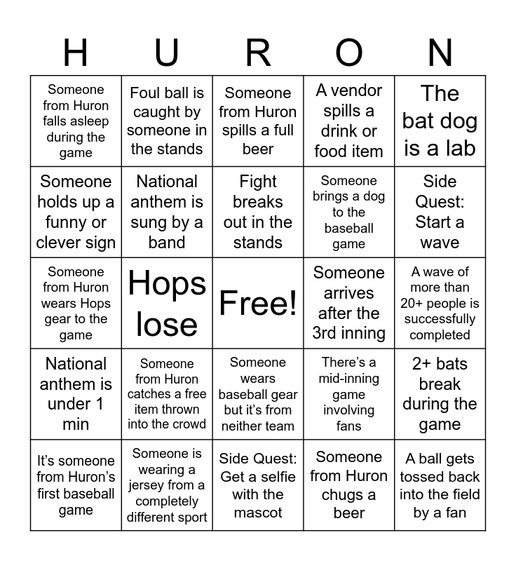 This bingo card has a free space and 32 words: Someone from Huron chugs a beer, Someone falls in the stands, Hops lose, Score difference is greater than 2, National anthem is under 1 min, National anthem is sung by a band, The bat dog is a lab, 2+ bats break during the game, Foul ball is caught by someone in the stands, Someone throws up at the game, Fight breaks out in the stands, Someone from Huron spills a full beer, Game goes into extra innings, Someone takes a meeting during the game, Someone arrives after the 3rd inning, Someone opens their laptop to the stadium to work (but doesn’t take a meeting), It’s someone from Huron’s first baseball game, Someone from Huron wears Hops gear to the game, Someone wears baseball gear but it’s from neither team, Someone from Huron catches a free item thrown into the crowd, There’s a mid-inning game involving fans, Umpire makes a controversial call and stadium collectively boos, A wave of more than 20+ people is successfully completed, Someone is wearing a jersey from a completely different sport, A ball gets tossed back into the field by a fan, A vendor spills a drink or food item, Someone brings a dog to the baseball game, Someone holds up a funny or clever sign, Someone from Huron falls asleep during the game, Side Quest: Get a selfie with the mascot, Side Quest: Take a selfie with someone wearing Huron branded apparel and Side Quest: Start a wave.