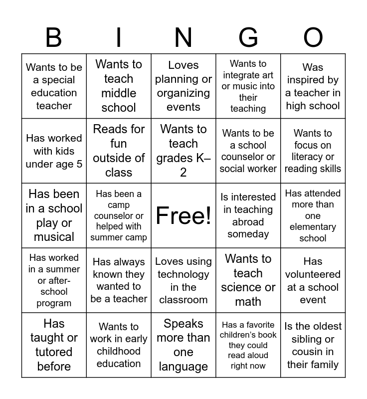 This bingo card has a free space and 25 words: Has always known they wanted to be a teacher, Speaks more than one language, Wants to teach grades K–2, Has taught or tutored before, Was inspired by a teacher in high school, Wants to be a special education teacher, Has worked with kids under age 5, Wants to teach middle school, Is interested in teaching abroad someday, Loves using technology in the classroom, Wants to be a school counselor or social worker, Has been in a school play or musical, Wants to teach science or math, Has volunteered at a school event, Reads for fun outside of class, Wants to coach a school sport, Has attended more than one elementary school, Loves planning or organizing events, Wants to focus on literacy or reading skills, Has been a camp counselor or helped with summer camp, Is the oldest sibling or cousin in their family, Wants to work in early childhood education, Has worked in a summer or after-school program, Wants to integrate art or music into their teaching and Has a favorite children’s book they could read aloud right now.