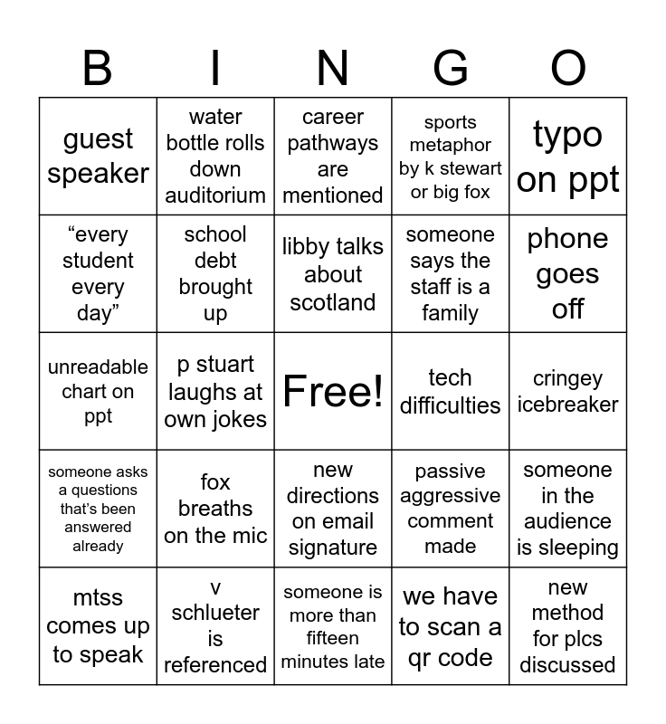This bingo card has a free space and 24 words: fox breaths on the mic, v schlueter is referenced, libby talks about scotland, mtss comes up to speak, typo on ppt, guest speaker, “every student every day”, water bottle rolls down auditorium, tech difficulties, new directions on email signature, someone says the staff is a family, unreadable chart on ppt, passive aggressive comment made, someone in the audience is sleeping, school debt brought up, we have to scan a qr code, cringey icebreaker, career pathways are mentioned, phone goes off, p stuart laughs at own jokes, new method for plcs discussed, someone asks a questions that’s been answered already, sports metaphor by k stewart or big fox and someone is more than fifteen minutes late.