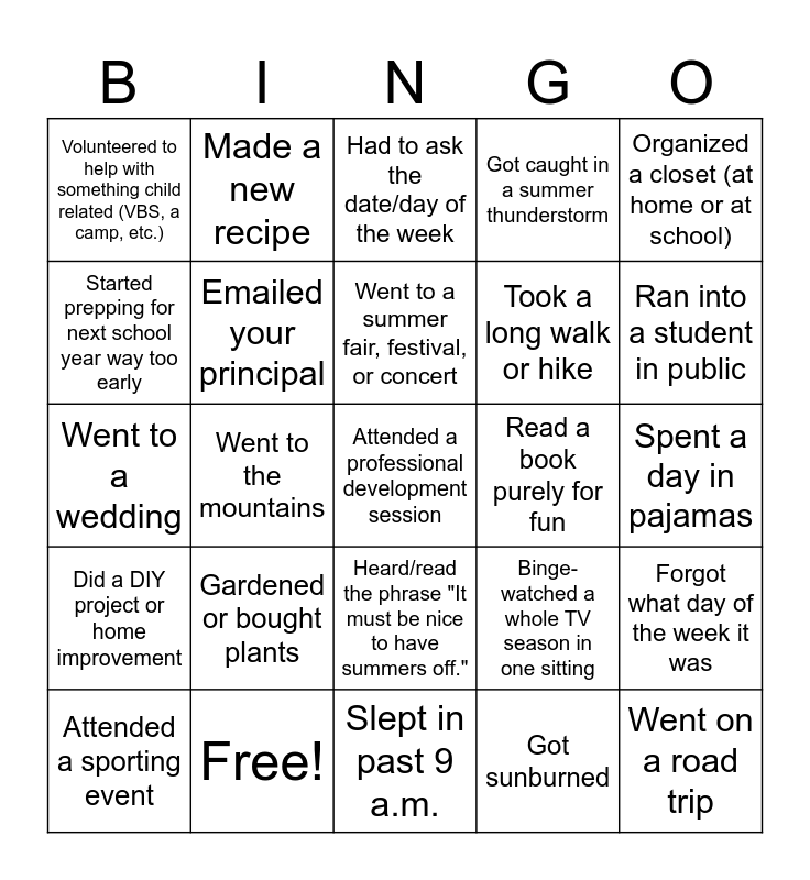 This bingo card has 30 words: Free!, Went to the beach, Went to the mountains, Stepped inside your classroom, Volunteered to help with something child related (VBS, a camp, etc.), Had to ask the date/day of the week, Emailed your principal, Heard/read the phrase "It must be nice to have summers off.", Read a book purely for fun, Slept in past 9 a.m., Spent a day in pajamas, Attended a professional development session, Got sunburned, Went on a road trip, Ran into a student in public, Took a nap in the middle of the day, Binge-watched a whole TV season in one sitting, Did a DIY project or home improvement, Gardened or bought plants, Organized a closet (at home or at school), Went to a wedding, Traveled out of state/country, Made a new recipe, Took a long walk or hike, Started prepping for next school year way too early, Got caught in a summer thunderstorm, Forgot what day of the week it was, Attended a sporting event, Went to a summer fair, festival, or concert and Went to the library.