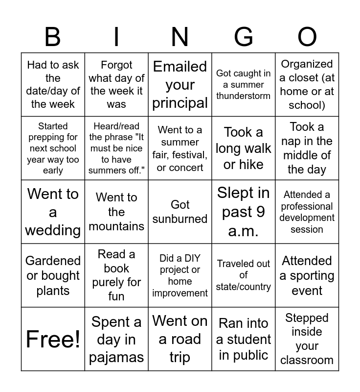 This bingo card has 29 words: Free!, Went to the beach, Went to the mountains, Stepped inside your classroom, Had to ask the date/day of the week, Emailed your principal, Heard/read the phrase "It must be nice to have summers off.", Read a book purely for fun, Slept in past 9 a.m., Spent a day in pajamas, Attended a professional development session, Got sunburned, Went on a road trip, Ran into a student in public, Took a nap in the middle of the day, Binge-watched a whole TV season in one sitting, Did a DIY project or home improvement, Gardened or bought plants, Organized a closet (at home or at school), Went to a wedding, Traveled out of state/country, Made a new recipe, Took a long walk or hike, Started prepping for next school year way too early, Got caught in a summer thunderstorm, Forgot what day of the week it was, Attended a sporting event, Went to a summer fair, festival, or concert and Went to the library.