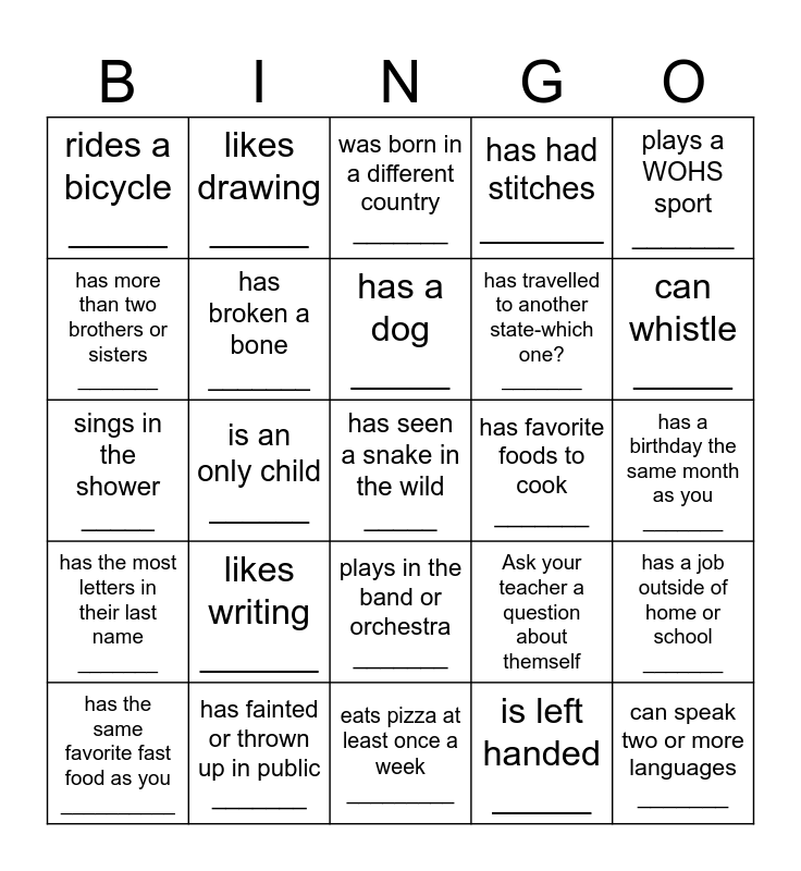 This bingo card has 25 words: likes writing ______, eats pizza at least once a week _________, has a dog _____, has the same favorite fast food as you __________, plays a WOHS sport _______, rides a bicycle _____, has more than two brothers or sisters _______, likes drawing _____, has favorite foods to cook _______, plays in the band or orchestra _______, has travelled to another state-which one? _______, sings in the shower _____, Ask your teacher a question about themself, has a job outside of home or school _______, has broken a bone _______, can speak two or more languages _______, has a birthday the same month as you _______, was born in a different country _______, can whistle _____, is an only child ______, has seen a snake in the wild _____, has fainted or thrown up in public _______, has the most letters in their last name _______, has had stitches _______ and is left handed _____.