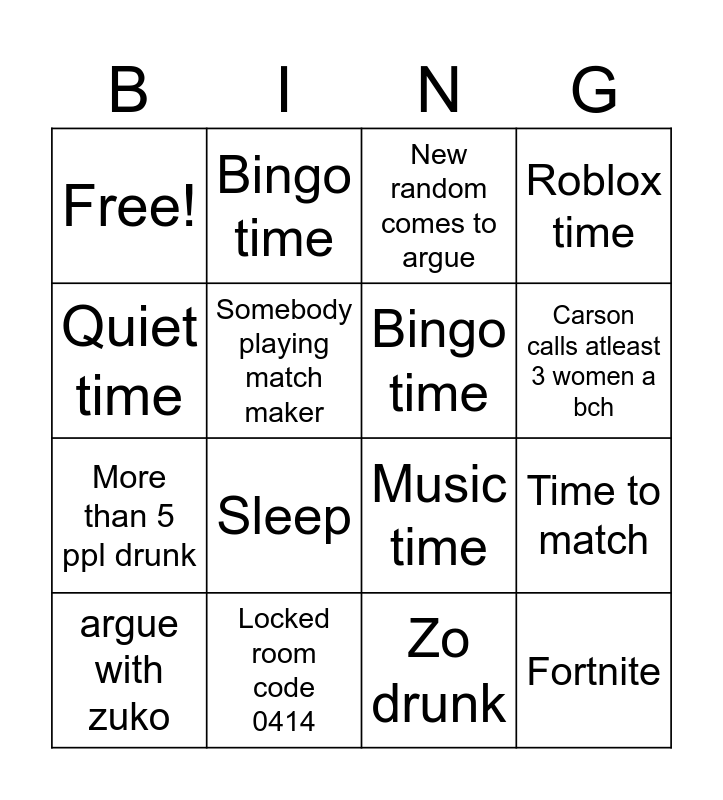 This bingo card has 16 words: argue with zuko, Locked room code 0414, New random comes to argue, Roblox time, Quiet time, Bingo time, Music time, Time to match, Free!, Somebody playing match maker, Zo drunk, Carson calls atleast 3 women a bch, More than 5 ppl drunk, Sleep, Bingo time and Fortnite.