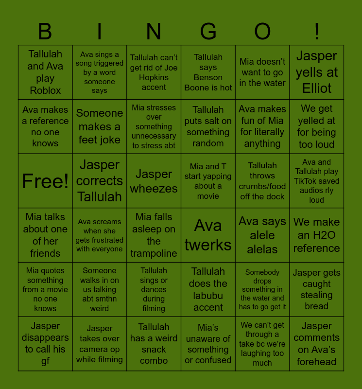 This bingo card has 36 words: Tallulah does the labubu accent, Tallulah sings or dances during filming, Mia’s unaware of something or confused, Ava makes a reference no one knows, Mia talks about one of her friends, Mia and T start yapping about a movie, Someone makes a feet joke, Tallulah has a weird snack combo, Mia doesn’t want to go in the water, Somebody drops something in the water and has to go get it, We get yelled at for being too loud, Tallulah says Benson Boone is hot, Jasper gets caught stealing bread, Jasper corrects Tallulah, Tallulah puts salt on something random, Tallulah and Ava play Roblox, Mia quotes something from a movie no one knows, Tallulah throws crumbs/food off the dock, Free!, Tallulah can’t get rid of Joe Hopkins accent, Jasper wheezes, Ava screams when she gets frustrated with everyone, Ava twerks, Mia falls asleep on the trampoline, Ava says alele alelas, Ava sings a song triggered by a word someone says, Ava makes fun of Mia for literally anything, Jasper takes over camera op while filming, Mia stresses over something unnecessary to stress abt, Jasper yells at Elliot, Jasper comments on Ava’s forehead, Jasper disappears to call his gf, We make an H2O reference, Ava and Tallulah play TikTok saved audios rly loud, Someone walks in on us talking abt smthn weird and We can’t get through a take bc we’re laughing too much.