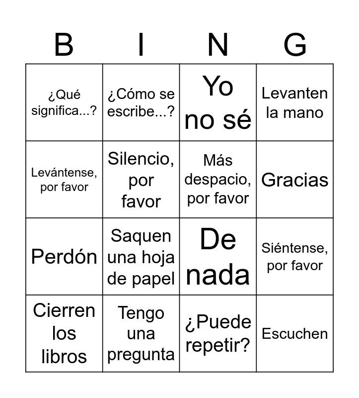 This bingo card has 21 words: Tengo una pregunta, ¿Cómo se dice...?, ¿Cómo se escribe...?, No entiendo, ¿Puede repetir?, Más despacio, por favor, ¿Qué significa...?, Yo no sé, De nada, Gracias, Perdón, Levanten la mano, Escuchen, ¡Su atención, por favor!, Silencio, por favor, Abran sus libros, Cierren los libros, Saquen una hoja de papel, Levántense, por favor, Siéntense, por favor and Repitan después de mí.